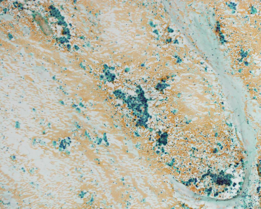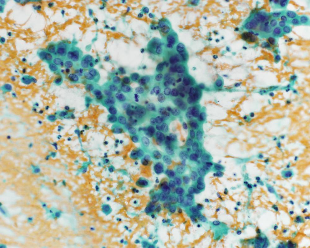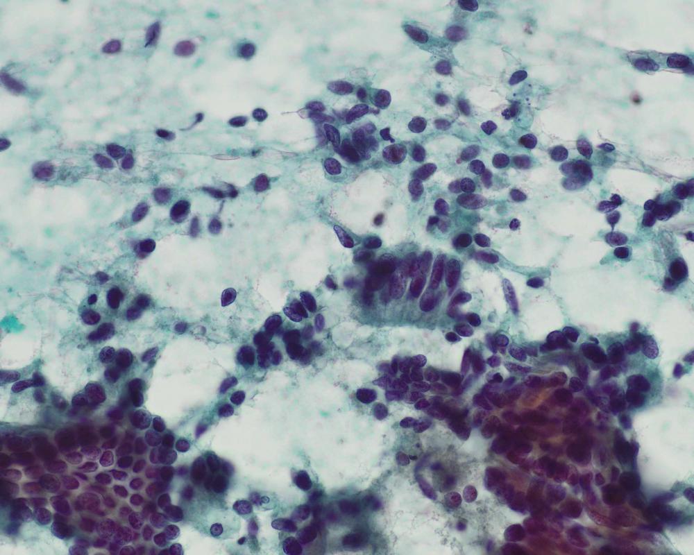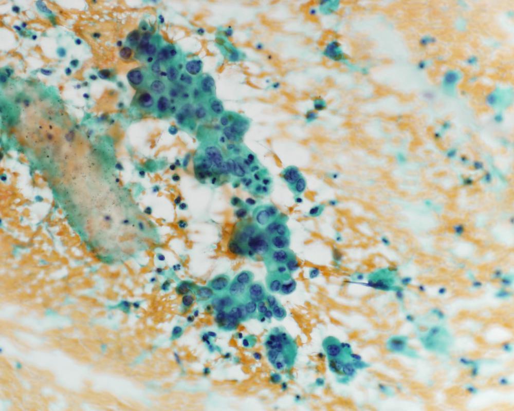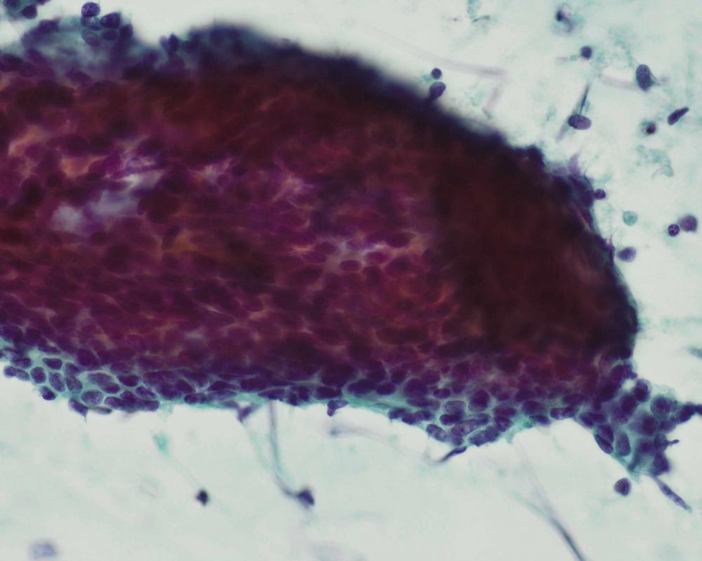 現病歴:前立腺癌の経過観察のCTにて右肺結節を指摘された。PSA含めて腫瘍マーカーは正常であった。本標本は術中迅速組織診断用に提出された肺腫瘍の捺印細胞診検体である。