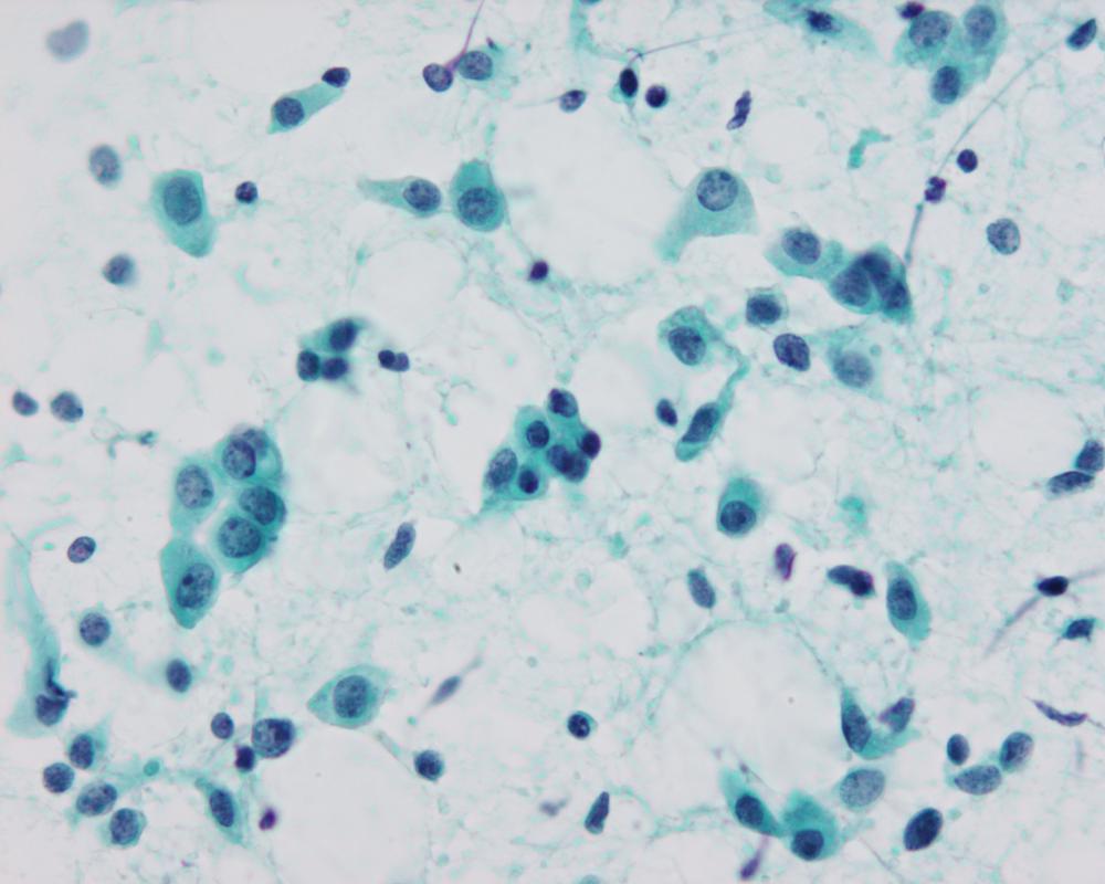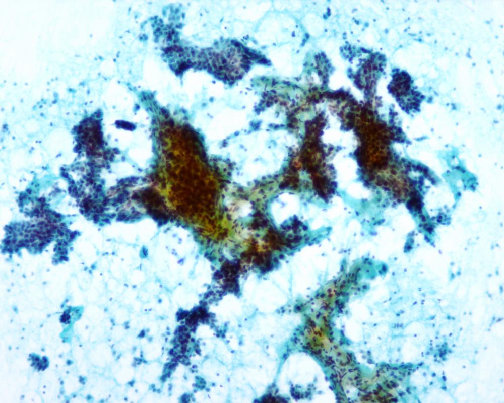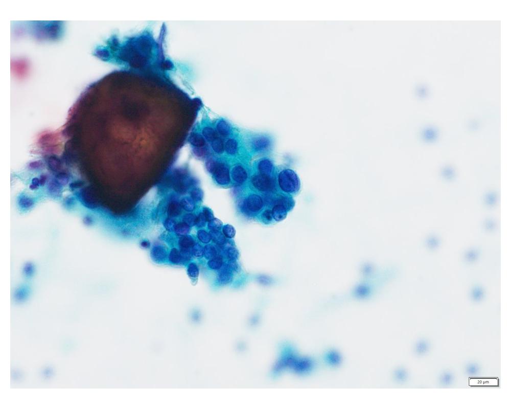 現病歴:1週間前より頸部腫脹を自覚。頸部に軽度圧痛のある弾性硬,可動性不良の8.5x5.0cmの腫瘤を認め,画像上甲状腺右葉に石灰化を伴う腫瘍を認めた。同部より細胞診が施行された。