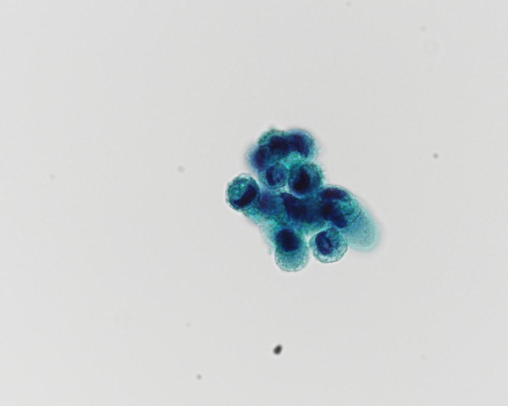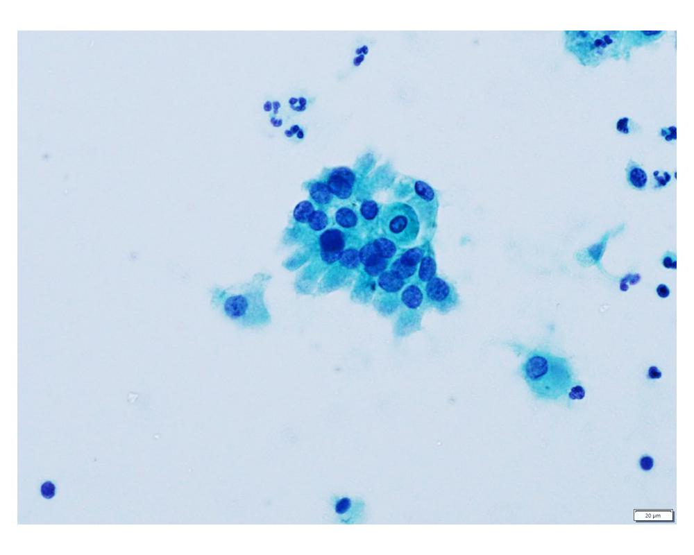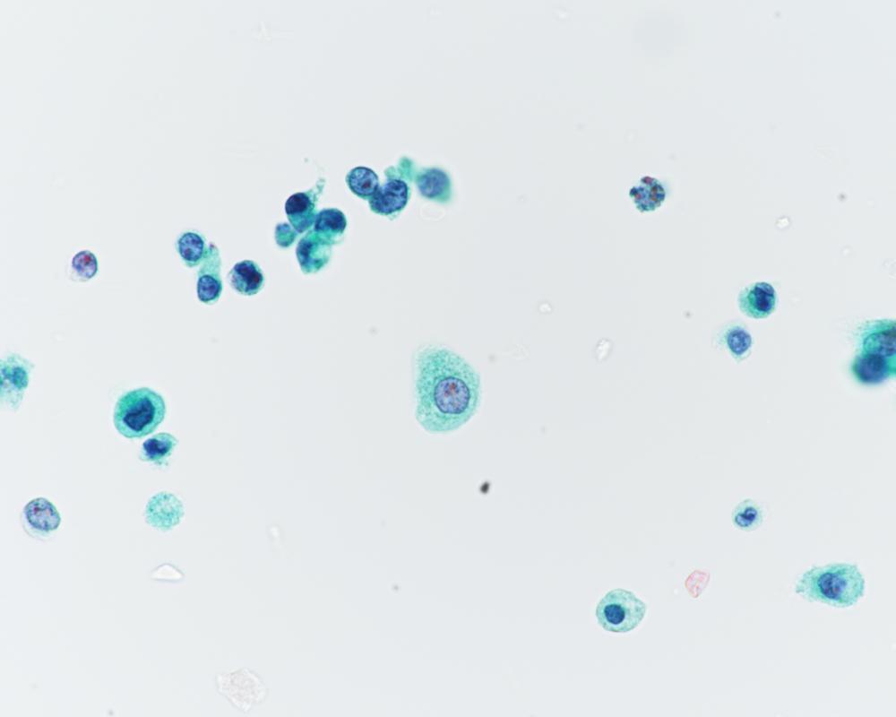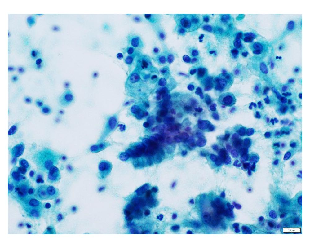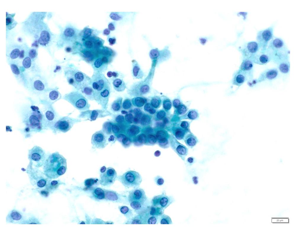 現病歴:S状結腸癌ならびに肺転移にて化学療法中。2週間前から排尿困難、残尿感があり、泌尿器科に紹介された。直腸診で前立腺は超胡桃大、全体に固く表面やや不整であった。精査のため、まず尿細胞診が行われた。