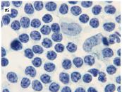 穿刺吸引細胞診(#1-4)と捺印細胞診(#5,6)のpapanicolaou染色、Giemsa染色を示す。