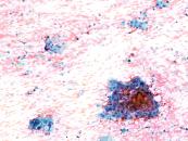 現 病 歴:約5ケ月前に発熱、左乳房痛があり、乳腺炎と診断された。抗生剤投与で軽快したが、胸背部痛、腰痛、微熱が続いていた。精査のためのCT画像で、左乳腺外側に不整な造影効果が認められ、乳癌が疑われた。エコーでは、左C領域に6×5㎝大の低エコー域を認めた。同部位より、穿刺吸引細胞診および吸引式組織生検(VAB)が行われた。